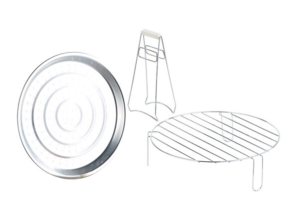 - Four à convection halogène avec 2 étages de cuisson, petite pince et grande pince métallique, plat pour cuisson à la vapeur, plaque ronde avec revêtement antiadhésif et brosse de nettoyage