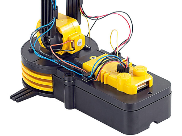 Ce robot jaune et noir permet d’appliquer les principes de base de la robotique. 5 moteurs, 3 axes, 1 base pivotante et une pince avec LED permettent une mobilité totale.