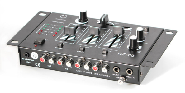 - 5 entrées : 2 phono/line, 1 CD et 2 micros (1 par voie)