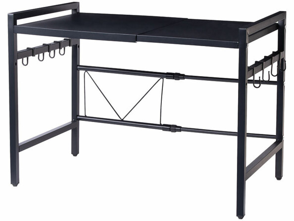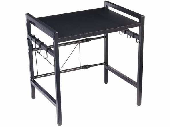 L'étagère solide accueille vos assiettes, vos ustensiles de cuisine, votre grille-pain ou votre robot culinaire : votre plan de travail reste ainsi dégagé, et votre matériel à portée de main. Vous pouvez aussi suspendre vos louches, torchons ou tasses aux crochets latéraux.