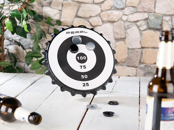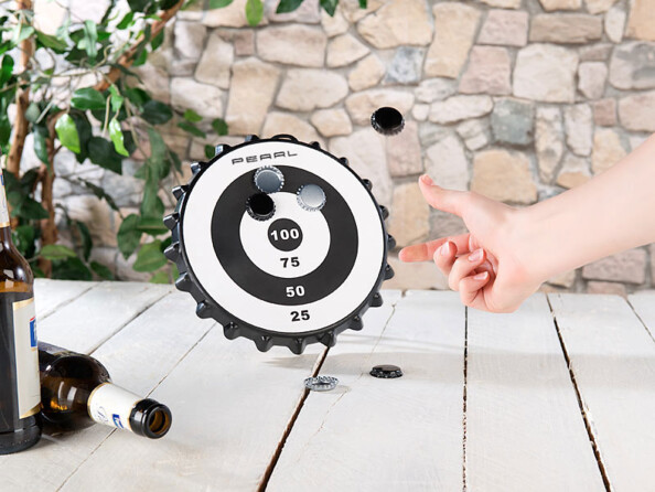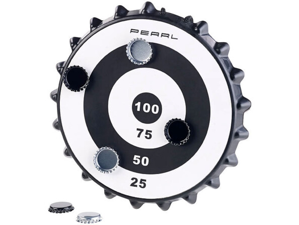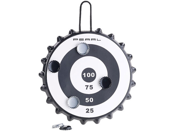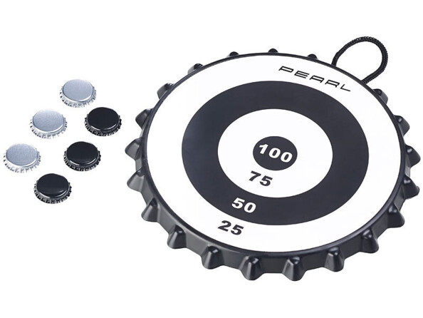Chaque capsule de bière, de soda ou de bouteilles d'eau peut servir de projectile. En effet, toutes les capsules ferromagnétiques disponibles dans le commerce adhèrent à la cible magnétique ronde. Vous savez ce qu'il vous reste à faire : consommer ! Prenez ensuite la capsule de votre boisson ouverte entre deux doigts, visez le centre de la cible et claquez-la dans le mille ! Le joueur qui récolte le plus de points à la fin de la soirée est sacré roi du caps !