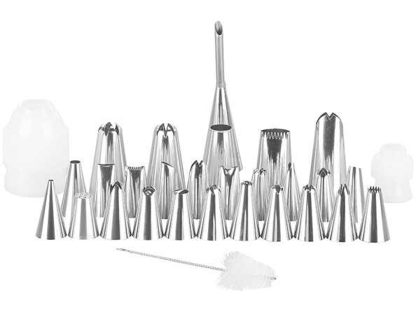 - Ce lot comprend 2 poches à douilles, 27 embouts, 2 convertisseurs de buses, 1 brosse de nettoyage, 1 sac de rangement, 3 spatules et un mode d'emploi en français