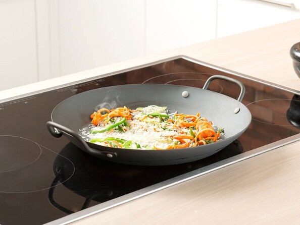L'acier carbone qui compose cette poêle a plusieurs avantages : il chauffe de manière homogène, peut être utilisé sur tous feux (gaz, induction, four...) et se nettoiera facilement à la main.