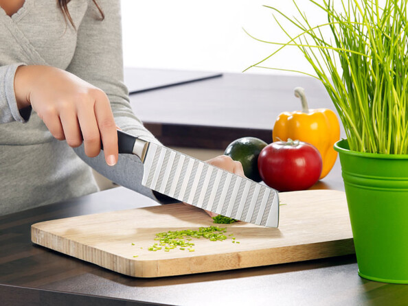 Ce couteau anti-adhérent permet d'effectuer des découpes précises, rapidement et sans effort. Car contrairement à d'autres types de couteaux, le revêtement de la lame empêche les aliments d'y adhérer. Sonsecret ? Les fines rainures verticales sur un côté de la lame permettent l'écoulement de l'humidité, empêchant ainsi la formation d'un dépôt sur la lame.