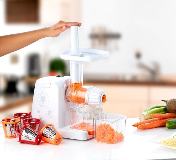 Cet accessoire se fixe tout simplement sur l'extracteur de jus, que vous pouvez alors utiliser comme robot pour râper et trancher vos légumes et fruits.