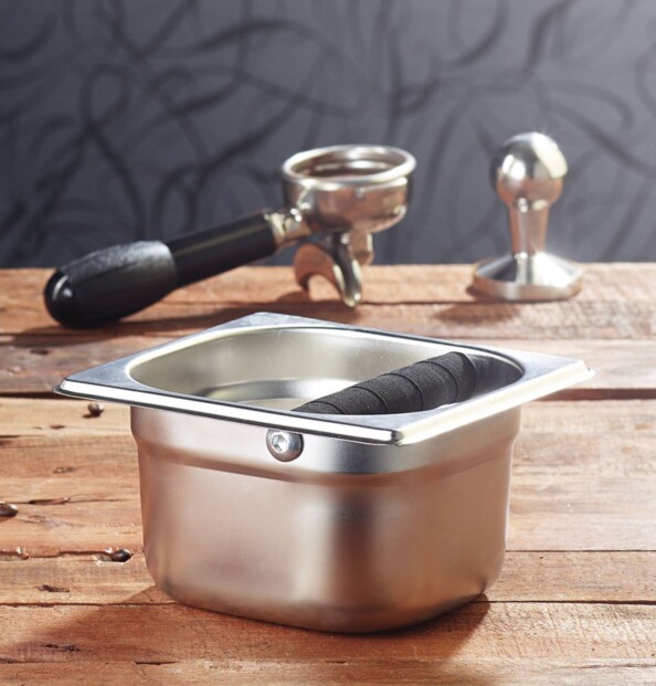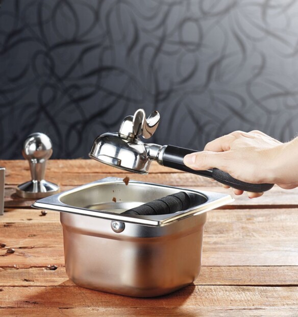 Une fois votre expresso préparé, retirez le porte-filtre de la machine, et frappez-le contre la barre du bac. Le marc tombe alors proprement dedans.