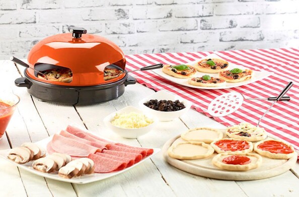 Cette version italienne et originale de la raclette permet à chacun de préparer sa pizza selon ses goûts. La classique au fromage, jambon et poivrons ou la version plus exotique avec du saumon, des crevettes et de l'ananas, ce four convient aux plaisirs les plus variés.