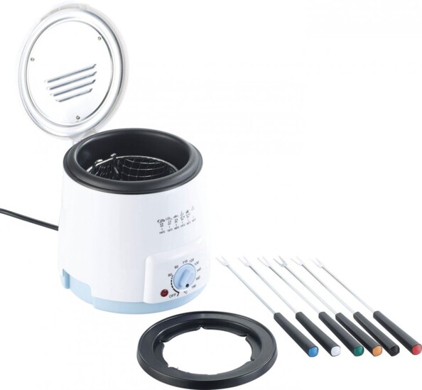 - Friteuse 2 en 1 livré avec panier à friture, anneau anti-éclaboussure, 6 fourchettes à fondue