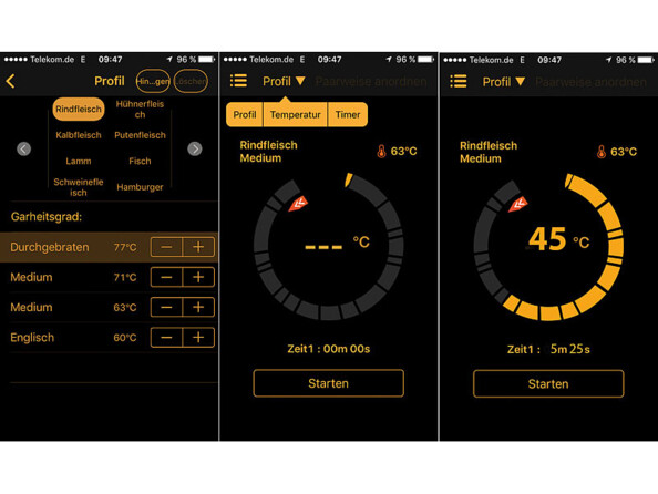 Grâce à l'application "SmartThermo" fonctionnant sur smartphones et tablettes Android ou iOS, vous obtenez une viande cuite exactement comme vous l'aimez. Spécifiez le type d'aliment que vous faites griller et le niveau de cuisson que vous souhaitez obtenir : de bleue à bien cuite. La sonde de température piquée dans la viande mesure la température moyenne. Vous êtes ainsi averti de l'état de la cuisson de votre steak, saucisse ou autre grillade.