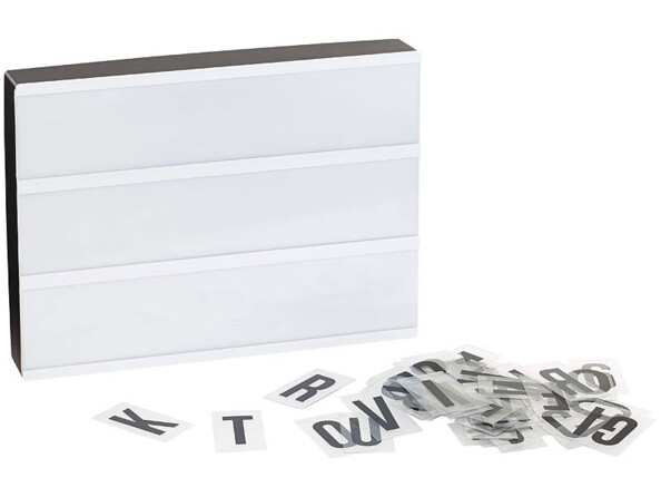Mixez les caractères comme vous le souhaitez pour former un message personnalisé à afficher à vos amis et proches qui viennent vous rendre visite : les 60 lettres et symboles vous offrent une infinité de possibilités de personnaliser cette boîte lumineuse, qui vous rappellera étrangement les enseignes lumineuses des cinémas américains. Message de bienvenue pour vos invités ou mot d'encouragement pour la journée, laissez libre court à votre imagination !