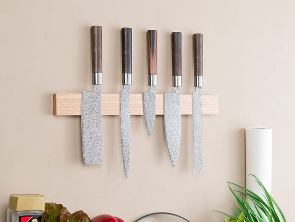 Grâce à une aimantation puissante, chaque couteau reste toujours rangé à sa place. Avantage supplémentaire : vous libérez de la place dans les tiroirs ou sur le plan de travail, tout en diminuant le risque de blessure. Même les ciseaux, outils en métal et les autres ustensiles de cuisine peuvent y être rangés.