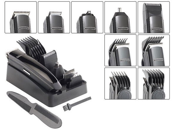 - Tondeuse de précision avec 7 embouts, peigne spécial barbe, pinceau de nettoyage, flacon d'huile lubrifiante, adaptateur secteur