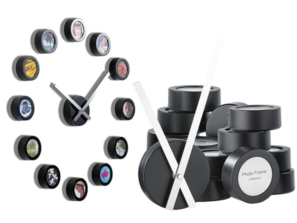 Cette horloge murale est composée de 12 petits cadres photos ronds que vous pouvez personnaliser avec vos propres photos souvenirs. Ainsi, même si l'horloge ne peut hélas pas remonter le temps, elle vous permet de revivre à tout instant vos plus beaux souvenirs sans oublier que l'heure tourne et que d'autres belles choses sont à venir.