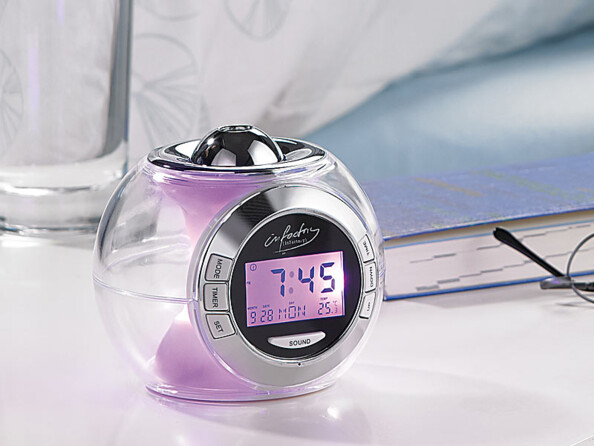 - Réveil sphérique : affiche l’heure, le jour, la date et la température ambiante