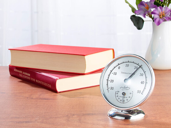Ce thermomètre / hygromètre avec design chrome est idéal sur votre bureau. Il peut aussi être accroché sur un mur à l'extérieur.
