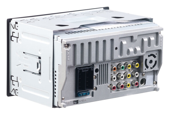 - Connexions pour l'installation : prise ISO pour l'alimentation et la sortie audio, entrée stéréo RCA, 2x sortie stéréo RCA, 3x entrée vidéo RCA, 2x sortie vidéo RCA, sortie subwoofer RCA, prise d'antenne ISO