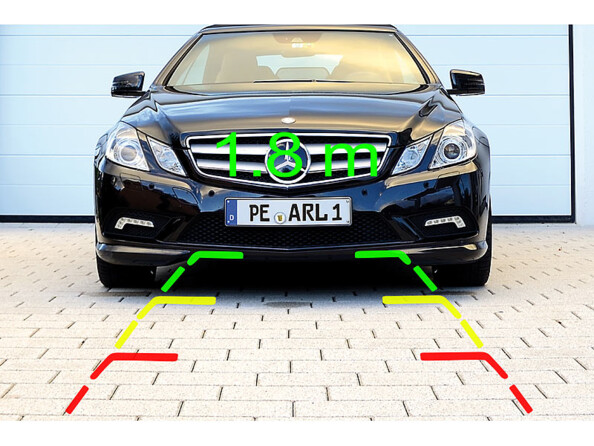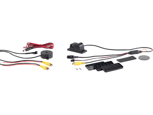 - Caméra de recul avec capteur d'aide au stationnement, contrôleur acoustique de distance, câble d'alimentation (100 cm), câble vidéo (6 m) et matériel de montage.