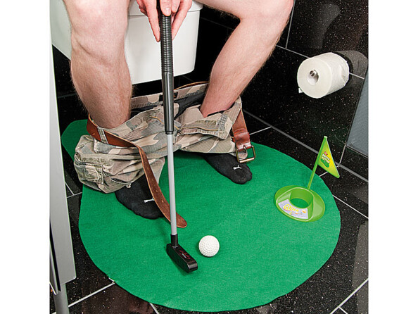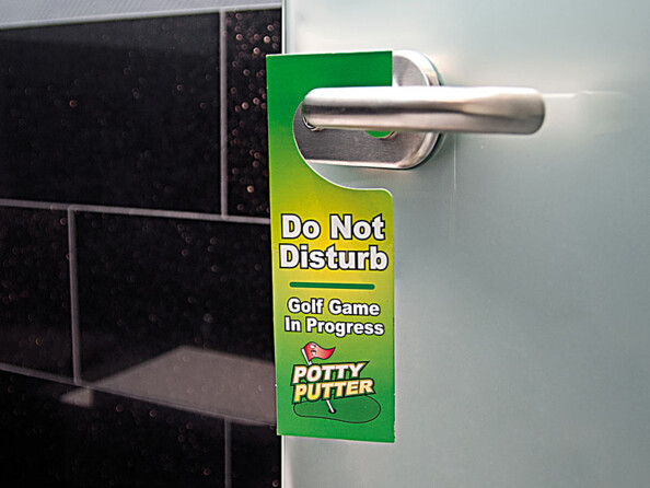 Jouez au minigolf dans vos toilettes ou votre salle de bain : nul besoin d'être debout pour améliorer votre handicap. Pour que personne ne vous dérange, placez sur la poignée de la porte le petit panneau amusant fourni.