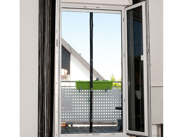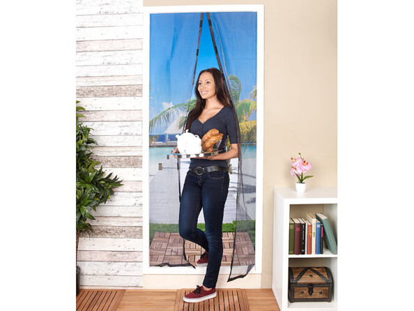 Elle est idéale sur une porte-fenêtre. Elle se fixe simplement sur le cadre de la porte, sans perçage ni vis, grâce aux scratchs autocollants. Grâce aux aimants, elle se referme toute seule après votre passage.