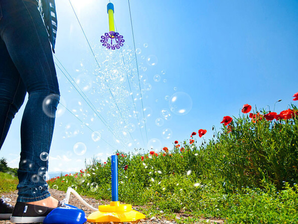 3... 2...1... Décollage ! Cette fusée s'élève jusqu'à 10 mètres dans les airs et laisse derrière elle une magnifique traînée de bulles. Tout simplement incroyable !