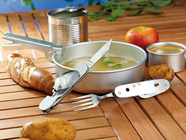 L’objet est séparable pour pouvoir utiliser le couteau et la fourchette en même temps. Il dispose en plus de deux cuillères, d’un tire-bouchon, d’un ouvre-canettes et d’un ouvre-boîte, ainsi que d’un pic et d’une spatule. Parfait pour un pique-nique, une randonnée ou un entraînement de survie en milieu hostile.