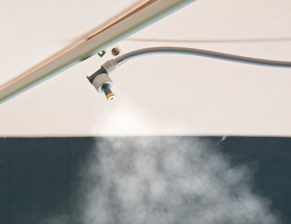 Transformez votre maison en une oasis pétillante : que l'eau soit vaporisée sous votre parasol, sur la balustrade de votre balcon ou sur votre terrasse. La température ambiante baisse de 9 °C grâce à la fraîcheur de l'évaporation. Il est ainsi possible de tenir le coup même sous le soleil étouffant de midi !