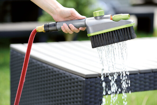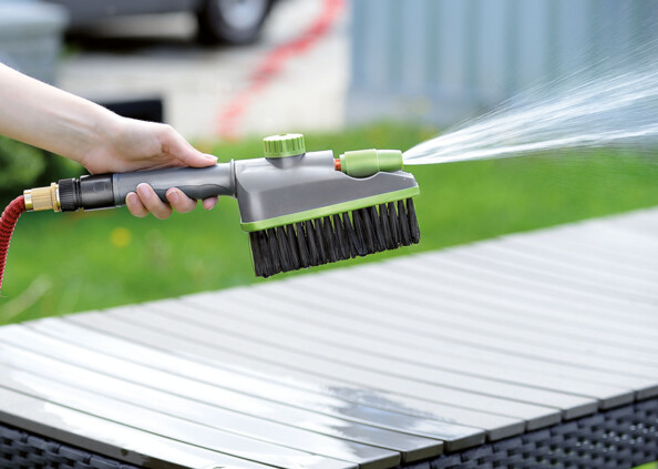 Avec la brosse 2 en 1, faites briller votre salon de jardin ! Nettoyez efficacement les salissures tenaces sur les meubles de jardin, la terrasse, les vélos, etc.