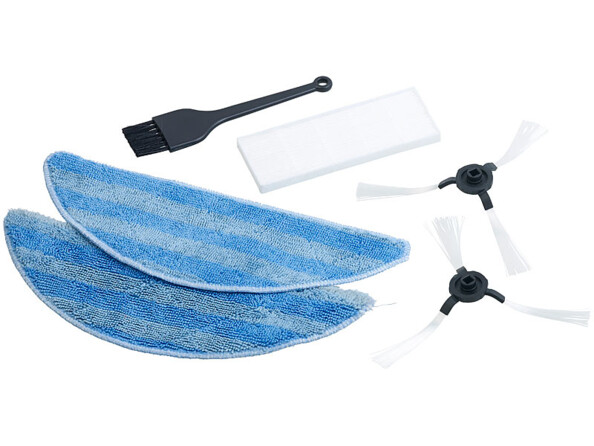 - Robot aspirateur livré avec 3 filtres HEPA (1 rechange), 4 brosses latérales (2 rechanges), 2 embouts de lavage (1 rechange), réservoir d'eau, station de chargement, télécommande, adaptateur secteur, pinceau de nettoyage, mode d'emploi en français