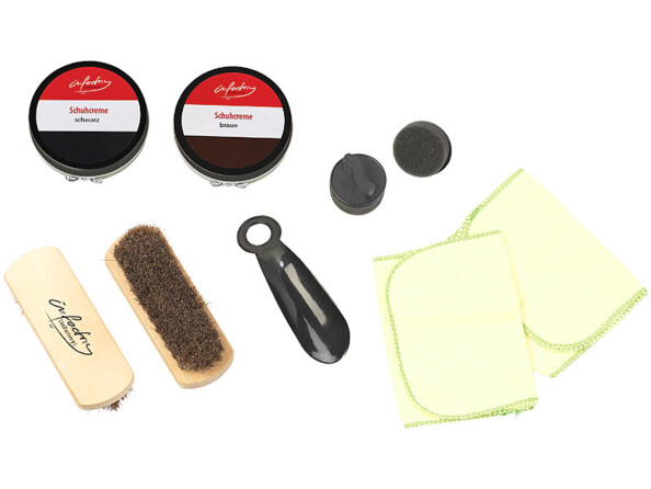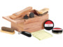Coffret à cirage livré avec 2 boîtes de cirage noir et brun (70 g chacune), 2 brosses, 2 éponges à polir, 2 chiffons, 1 chausse-pied
