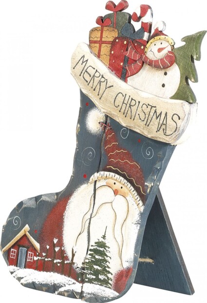 - Décoration à poser : Personnage peint sur une chaussette remplie de cadeaux
