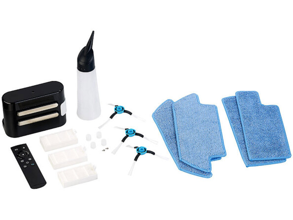 - Robot nettoyeur PCR-8800.app, station de chargement, adaptateur secteur, télécommande, 2 paires de serpillères, 3 filtres HEPA, 3 brosses nettoyantes, 4 buses de vaporisation, bouteille de dosage et mode d'emploi en français