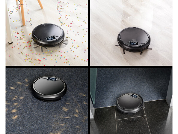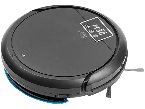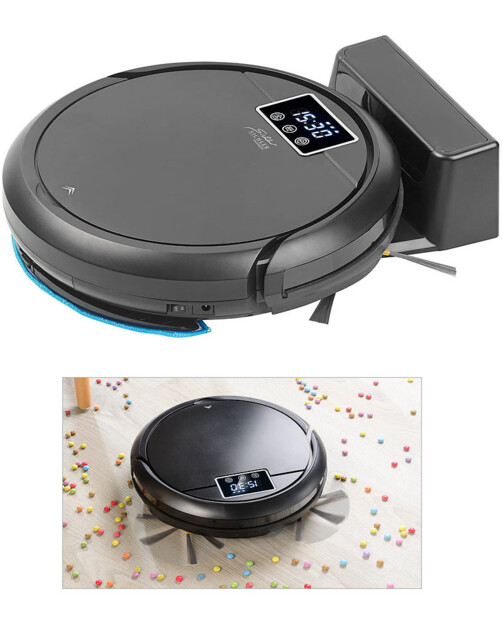- Contenu : robot aspirateur PCR-3000, 2 brosses latérales, réservoir et bac à poussière 2 en 1, 2 accessoires d'essuyage (1x de rechange), télécommande, filtre HEPA, brosse de nettoyage, station d'accueil, adaptateur secteur, mode d'emploi en français