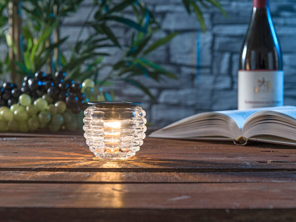 Aucun câble n'est nécessaire : grâce au chargement par énergie solaire, profitez d'une utilisation où bon vous semble. Il vous suffit d'exposer le photophore à LED au soleil, par exemple sur un rebord de fenêtre ou sur une table de jardin. Vous n'avez même pas besoin de piles !