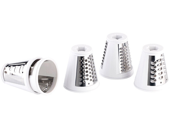- 5 éléments tranchants pour couper (grossièrement ou finement), hacher (grossièrement ou finement) et râper