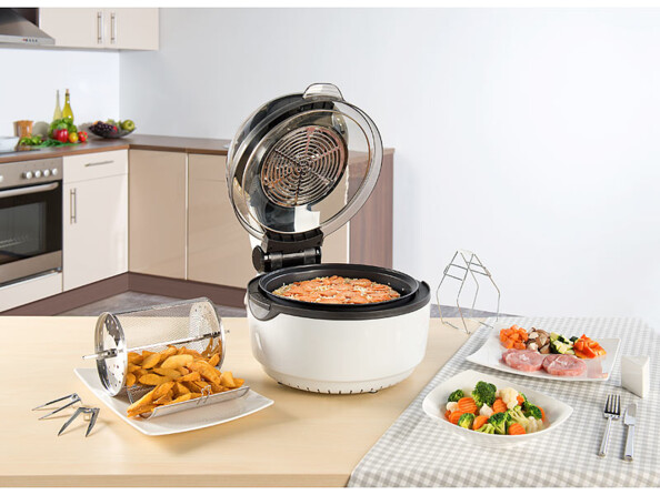 Frites croustillantes, poulets dorés, rôtis juteux… cuisinez ces plats sans une once de gras avec le four à convection halogène HK-10 et ses quatre accessoires de la marque Rosenstein & Söhne. Ce dernier combine lumière et air chaud, pour un préchauffage rapide et une répartition homogène de la chaleur.