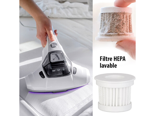 Il suffit de passer cet aspirateur innovant sur vos matelas, oreillers, coussins de canapés, etc. Grâce aux vibrations, les fines particules de poussière et les acariens sont libérés de la surface. En même temps, la lampe UV-C intégrée combat les bactéries, les virus et les germes. Votre habitation est alors enfin vraiment propre !