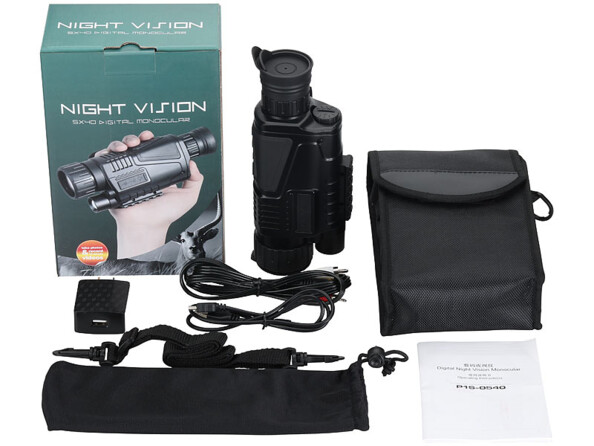 - Appareil de vision nocturne DN-350, inclus : batterie, câble USB, chargeur USB, câble vidéo (AV-cinch), chiffon de nettoyage, housse et mode d'emploi