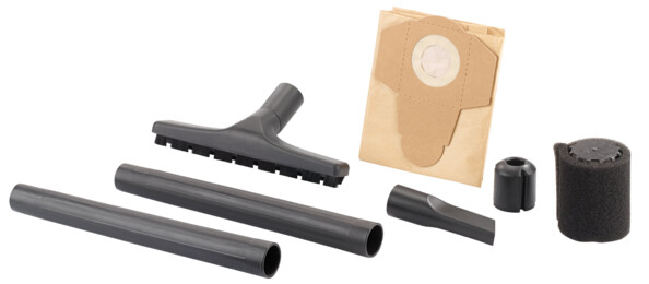 - Aspirateur eau et poussière avec tuyau d'aspiration (1,7 m), 2 embouts, 2 tubes de rallonge, panier avec filtre, filtre-éponge, bouchon et sac à poussière