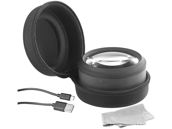 - Loupe de table LED, câble MicroUSB, chiffon de nettoyage, étui de rangement