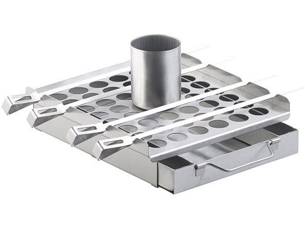 Donnez à votre viande un arôme digne des grands chefs grâce à la boîte à aromates que vous pouvez remplir de bière, de vin ou d’une marinade. Avec des notes fumées, vous ferez de vos steaks, truites ou poivrons de véritables expériences culinaires : remplissez simplement la boîte à aromates avec des copeaux de bois ou herbes aromatiques, ou des spiritueux. Préparez-vous de délicieux barbecues : viande ou poisson, les brochettes stables maintiennent vos aliments en place. Et grâce au support pratique, elles sont fermement maintenues ; vous pouvez les tourner et les retourner en un clin d’œil pour une cuisson uniforme. À vous les délicieux légumes grillés : placez simplement les poivrons, tomates, champignons dans les trous de la grille de cuisson. Ainsi, ils ne tombent pas de la grille et cuisent de manière optimale. Préparer le poisson et la viande est également un jeu d’enfant.