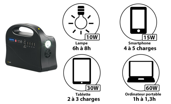 - Alimentation : batterie lithium-ion 26400 mAh (97 Wh), chargement par adaptateur secteur 230 V (fourni), adaptateur automobile 12 V ou panneau solaire (adaptateur automobile et panneau solaire non fournis)