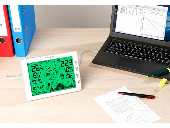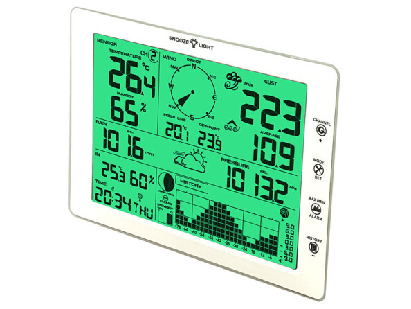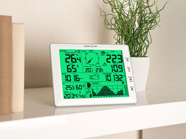 Grâce à cette station météo professionnelle FWS-1000, gardez un œil sur le temps qu'il fait chez vous. Vous bénéficiez d'un véritable bulletin météo à domicile : l'écran indique les températures intérieures et extérieures réelles et ressenties, le taux d'hygrométrie, la pression atmosphérique, la force et le sens du vent.