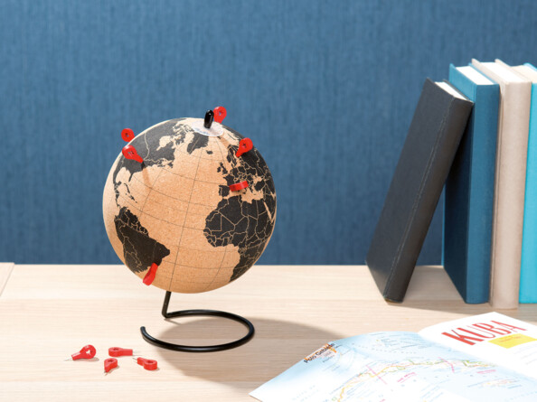 Gardez une trace de vos voyages passés en épinglant les pays que vous avez déjà visités sur votre globe en liège rotatif.