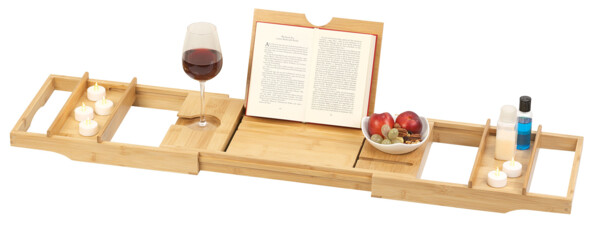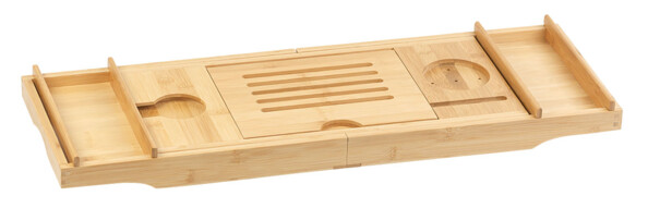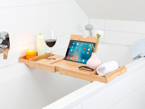 Le pont de baignoire en bambou se fixe sur toutes les baignoires classiques et constitue un support pratique pour tous vos accessoires : gel douche, savon, gant de toilette, mais également appareil mobile, livre et même verre, posez tout ce dont vous avez besoin sur la surface de bambou.