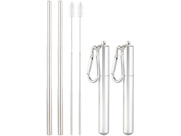Les jolies pailles en acier confèrent une allure chic vos boissons et peuvent être réutilisées à volonté. Mieux encore, elles sont télescopiques, de telle sorte que vous pouvez les emporter partout avec vous ! Rangez-les dans leur étui compact ou glissez-les sur votre porte-clés, vous êtes ainsi toujours paré pour un petit apéritif sur le pouce. L'acier inoxydable robuste ne se déforme pas et peut être nettoyé au lave-vaisselle. Sinon, utilisez le petit goupillon fourni pour un récurage en profondeur !