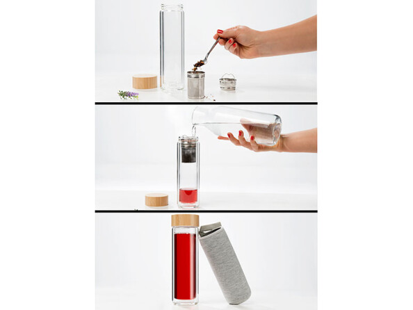 - Bouteille à thé, filtre en 2 parties, couvercle à visser, housse en polychloroprène