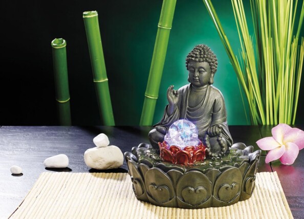 - Fontaine d'intérieur lumineuse avec fleurs de lotus, statue de Bouddha et boule en verre, par Infactory