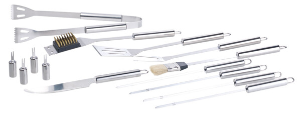 - 1 pince à barbecue, 1 fourchette, 1 couteau, 1 spatule, 4 broches, 4 supports pour épis de maïs, 1 pince spécial marinade, 1 brosse nettoyante en acier