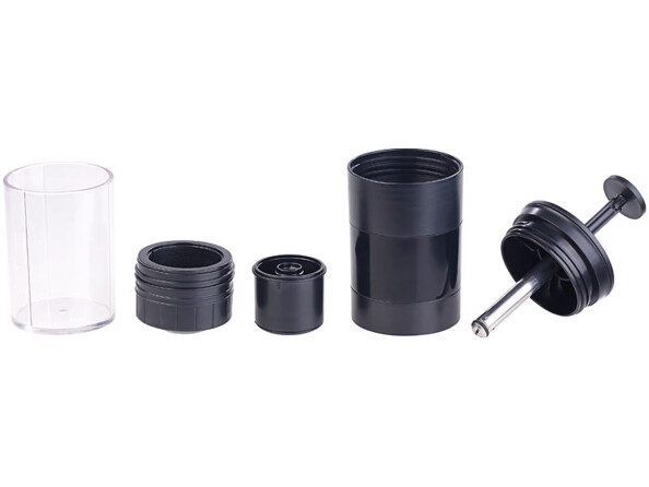 - Cafetière manuelle avec gobelet, compartiment pour capsules, 2 adaptateurs à capsules, réservoir d'eau, couvercle, barre de pression