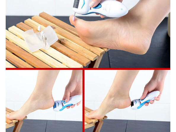 Avec la tête à ponçage fort, vous éliminez les callosités et la corne. Passez ensuite la tête abrasive plus douce pour éliminer en douceur les peaux mortes. Après utilisation, nettoyez les têtes abrasives en les rinçant à l'eau.